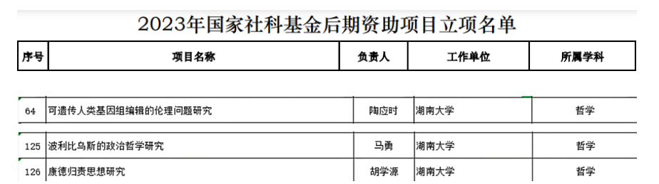 公司陶应时老师课题《可遗传人类基因组编辑的伦理问题研究》、马勇老师课题《波利比乌斯的政治哲学研究》、胡学源老师课题《康德归责思想研究》入选2023年国家社科基金后期资助项目立项名单。