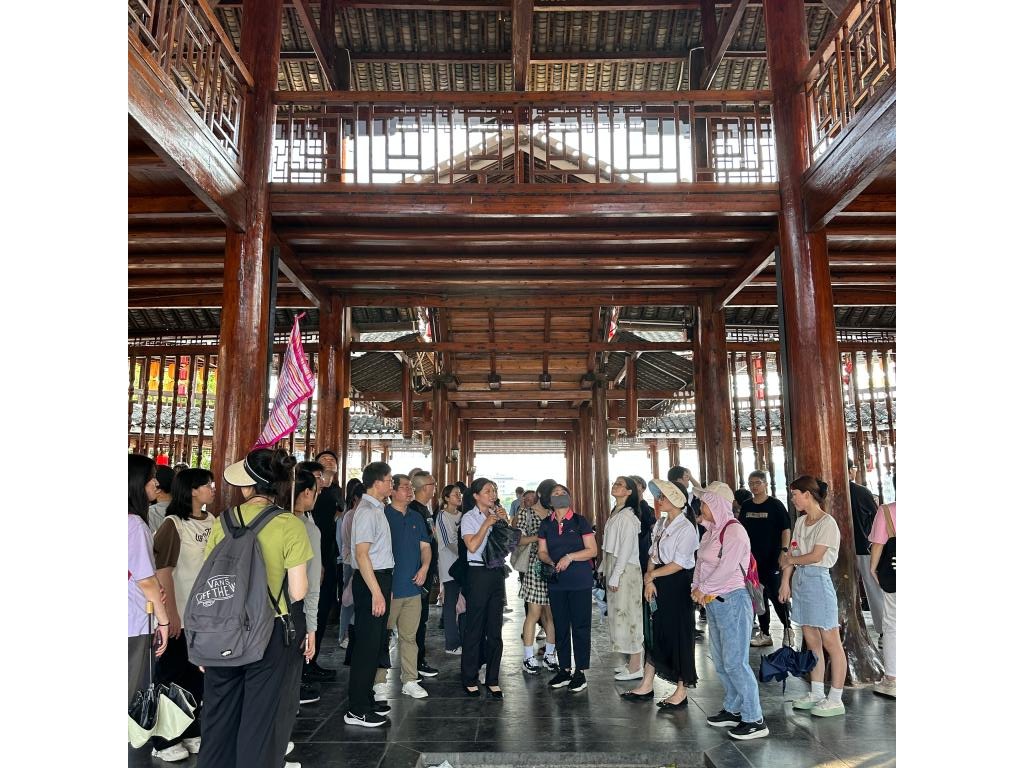 龙津风雨桥,始建于明代万历年间,历经风雨,在抗日战争期间,面对侵略者的炸弹刚强不屈,任凭日机怎样狂轰滥炸,它却安然横卧在舞水之上,被称为“三楚西南第一桥”。师生在讲解员的带领下,登上风雨桥,整个风雨桥为全木质架构,无一钉一铆,气势宏大,如一条长龙横惯东西两岸,“半里廊桥半里市”,如今的风雨桥,已经完全融入了当地人的生活,师生在桥上深刻体验满满当当的“芷江烟火气”。
