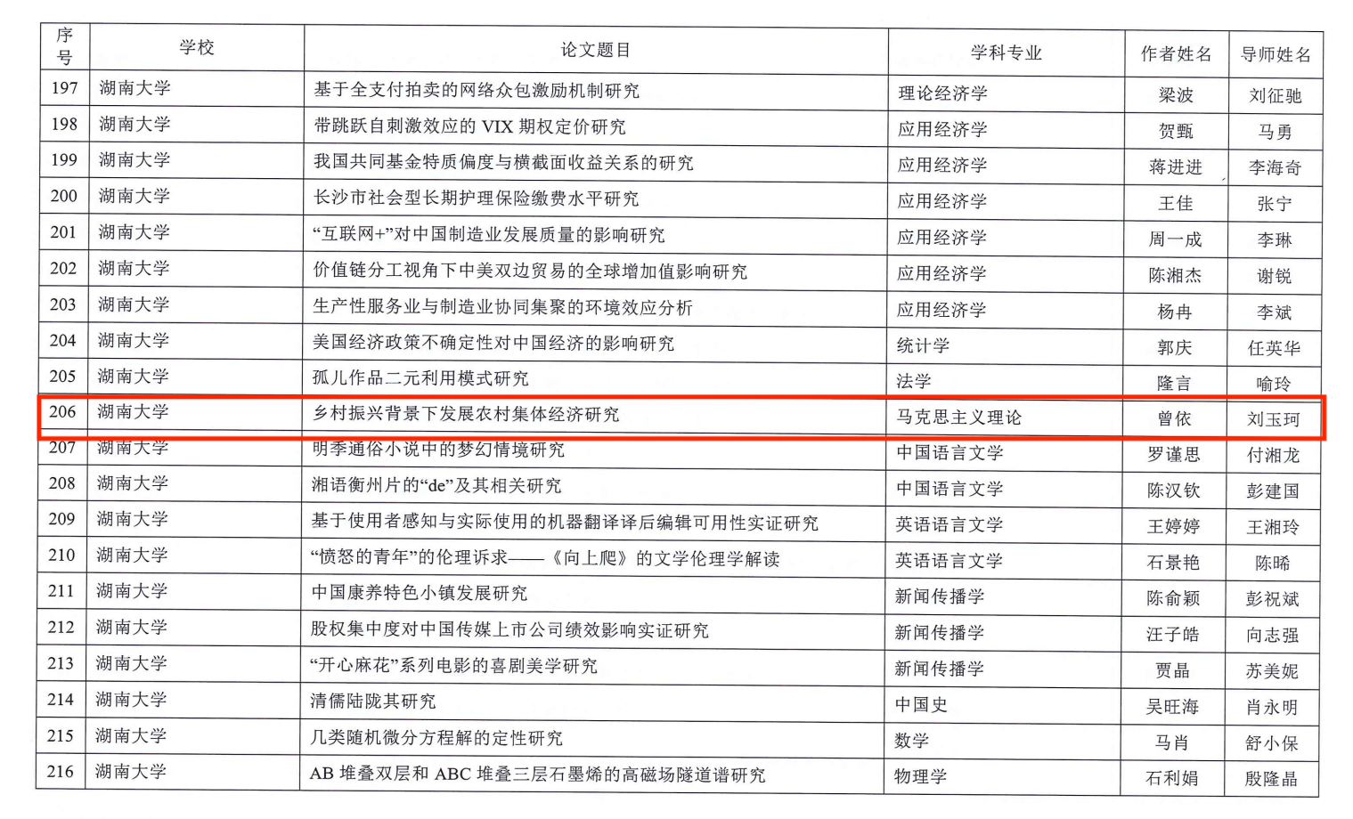 日前,湖南省教育厅公布了2022年湖南省优秀博士硕士学位论文名单。公司员工曾依论文《乡村振兴背景下发展农村集体经济研究》入选2022年湖南省优秀硕士学位论文名单,导师为刘玉珂教授。