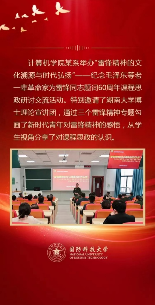 3月3日下午,国防科技大学计算机公司某系举办“雷锋精神的文化溯源与时代弘扬”一一纪念毛泽东等老一辈革命家为雷锋同志题词60周年课程思政研讨交流活动,球王会体育官网博士理论宣讲团3位讲师受邀参与。王希、陆径菠、刘倩分别从“弘扬雷锋精神彰显青年担当”“雷锋精神与红色文化的传承”“从弘扬雷锋精神中看课程思政”三个专题出发,阐述了新时代青年对雷锋精神的感悟,从员工视角分享了对课程思政的认识。