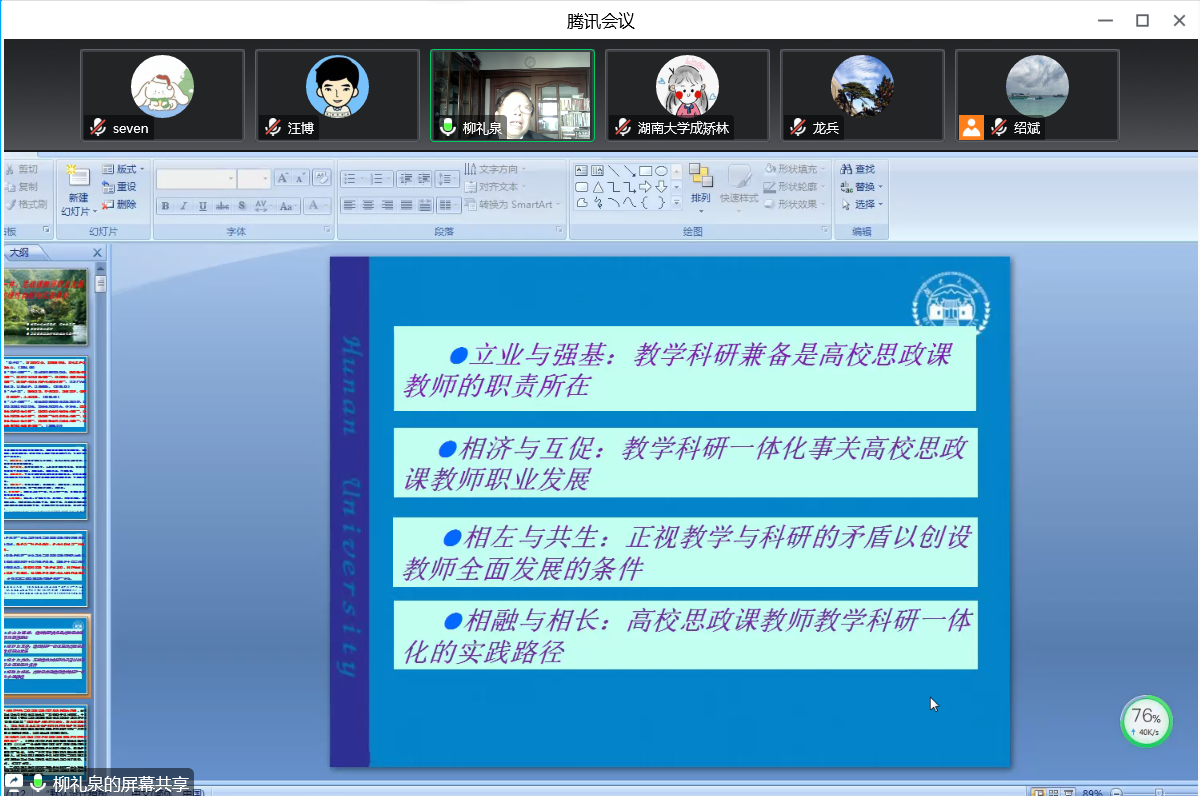 柳礼泉指出,教学与科研是高校思政课老师所肩负的两大职责,思政课教师必须坚持以科研作为根基,以学理为支撑,抓好教学这一“责任田”。必须不断攻克教学难关,精准领会党中央精神,强化马克思主义理论学科对教学科研的支撑作用,真正做到“以透彻的学理分析回应员工,以透彻的思想理论说服员工,以真理的强大力量引导员工”。