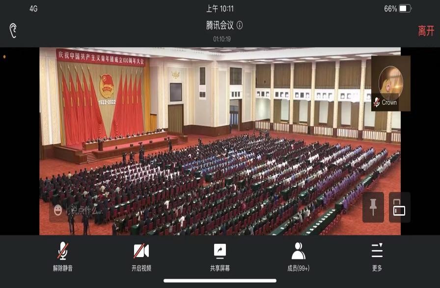 5月10日上午,庆祝中国共产主义青年团成立100周年大会在北京人民大会堂隆重举行。中共中央总书记、国家主席、中央军委主席习近平发表重要讲话。公司通过线上线下两种方式组织团员青年集中收看庆祝大会,党委副书记邹薇、团委书记刘玉芬、员工代表在教室收看。