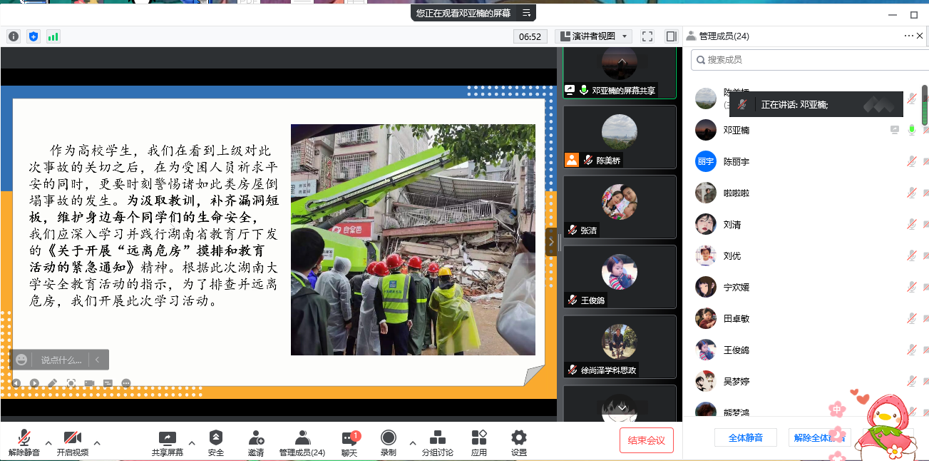 5月4日-6日,各党支部、班级线上线下结合开展了主题班会、党日活动,组织全体员工开展安全教育,学习《中华人民共和国建筑法》《校园安全管理相关意见》等相关法律法规,深入了解各类安全防护知识与避险逃生技能。