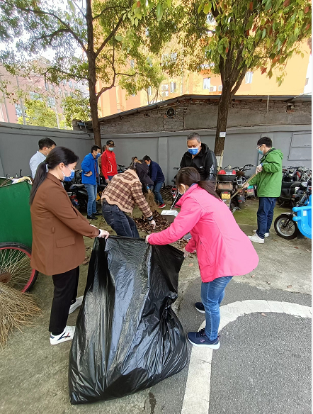 曲达老师与抗疫战友们一起打扫园区卫生。