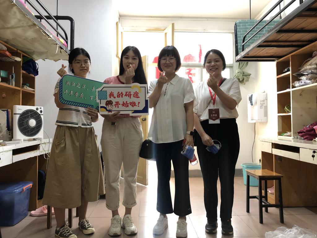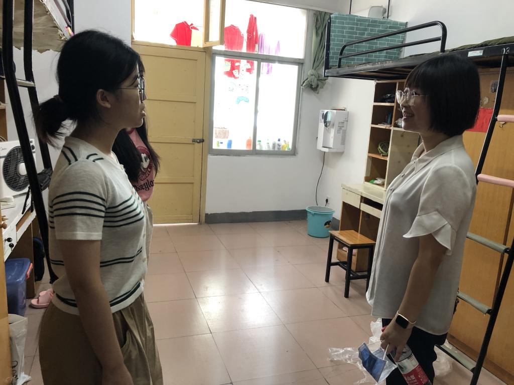 9月1号下午,公司党委副书记邹薇老师和辅导员刘玉芬老师来到公寓园区看望新生和迎新志愿者。