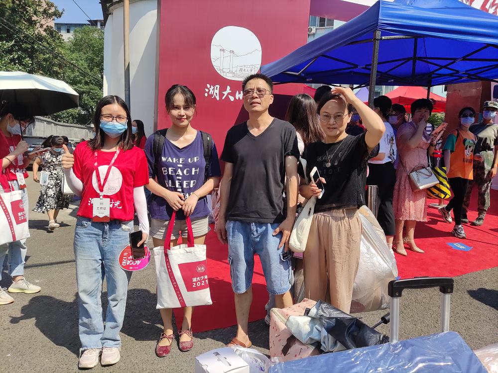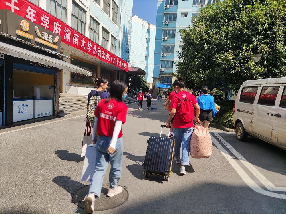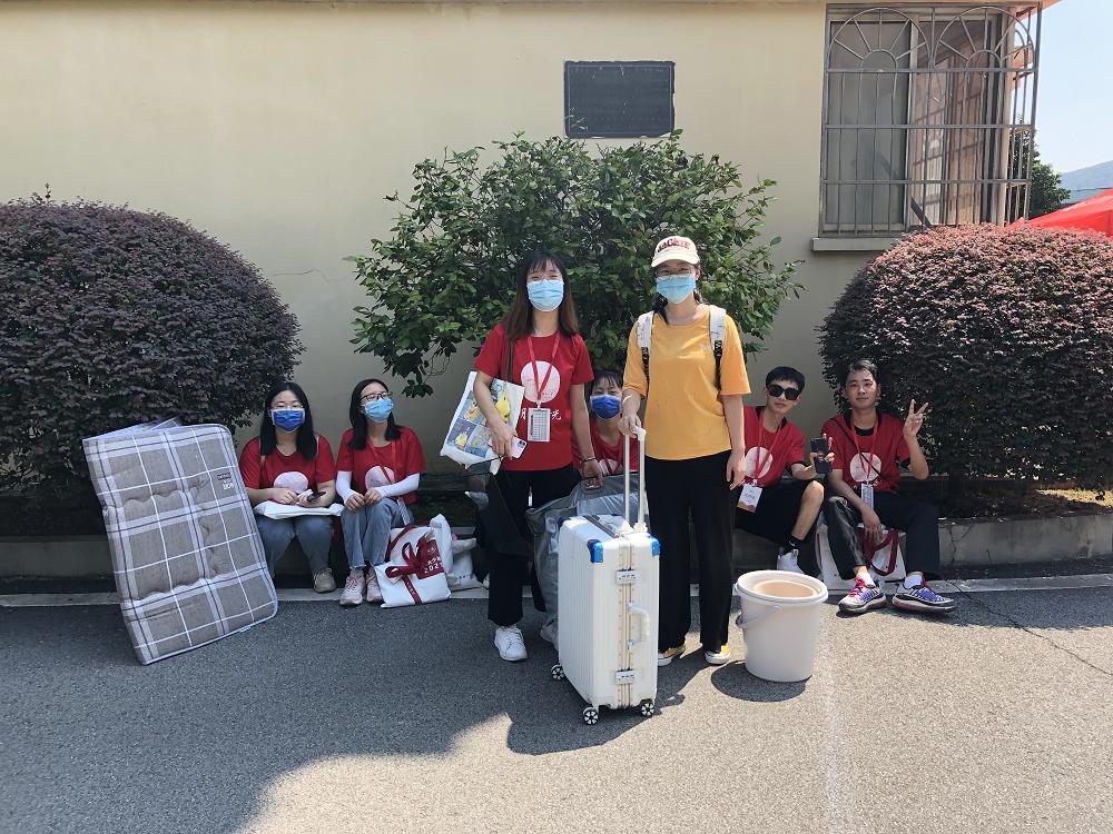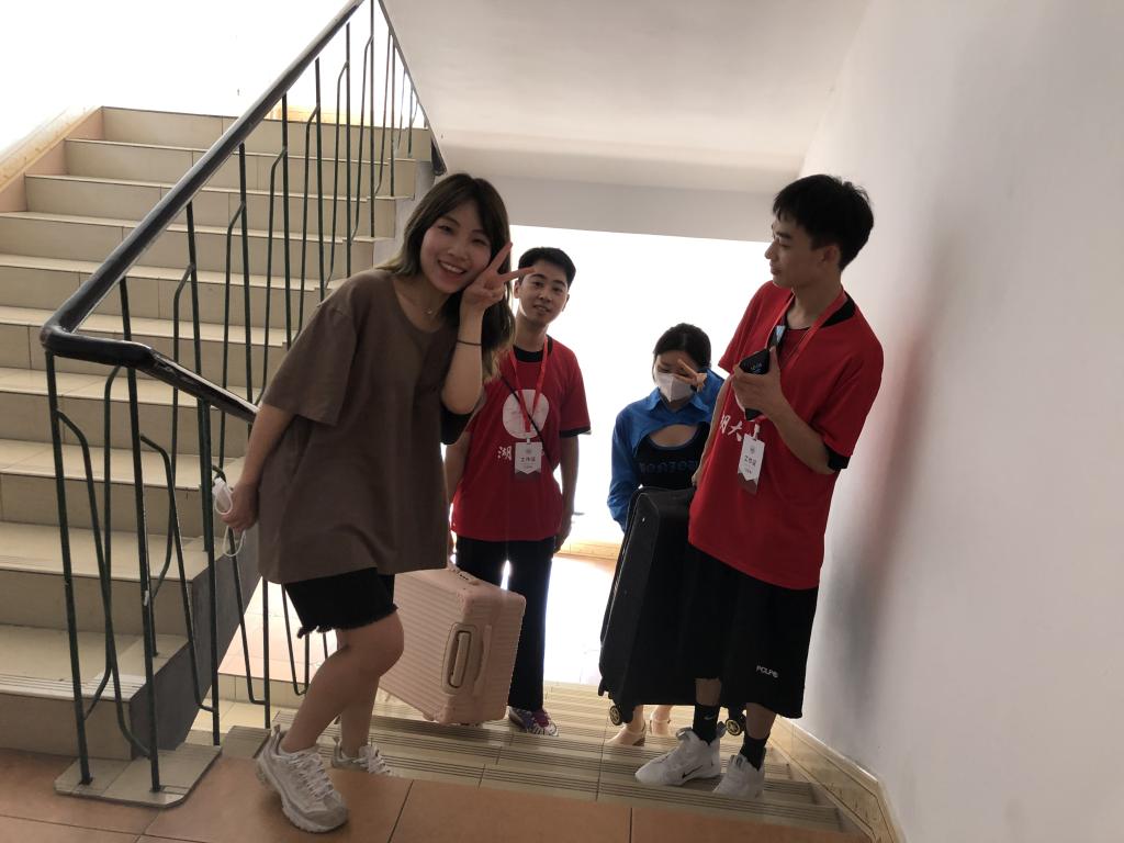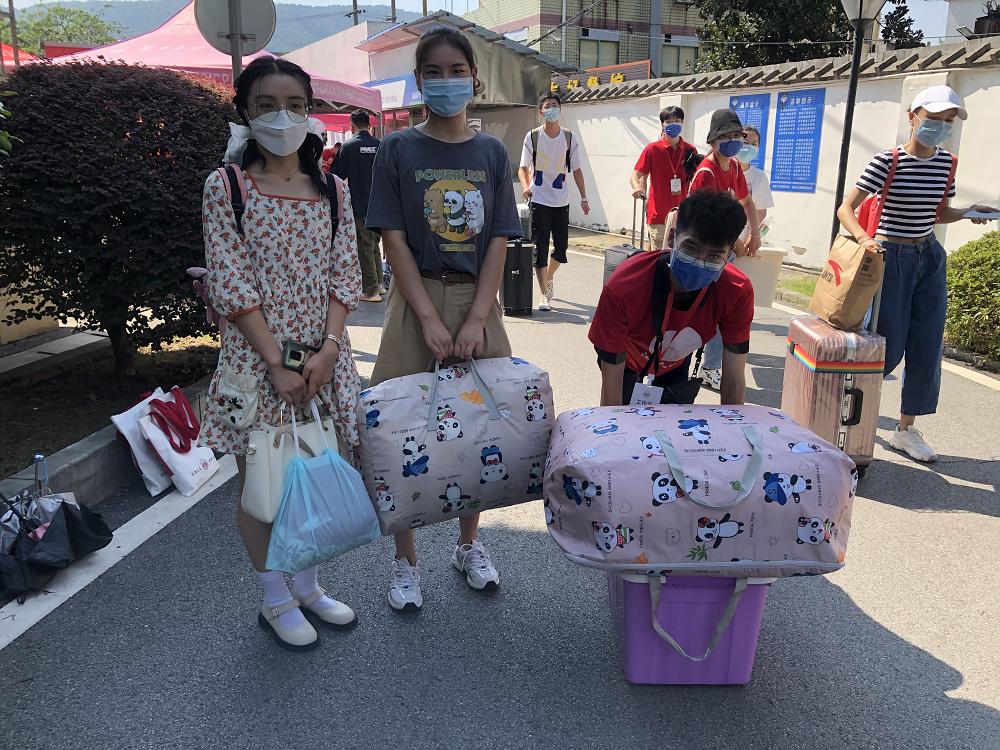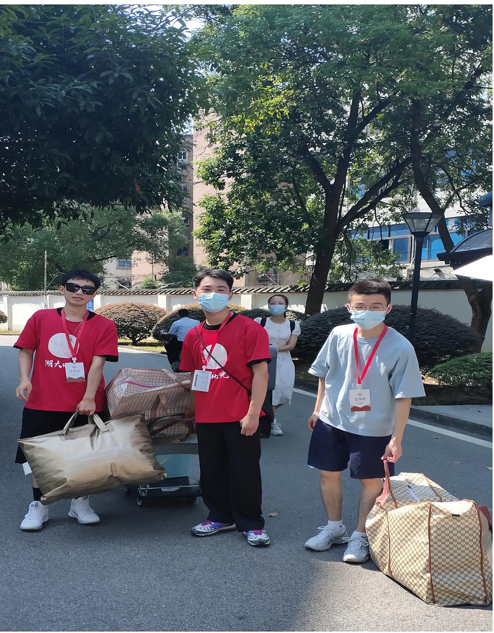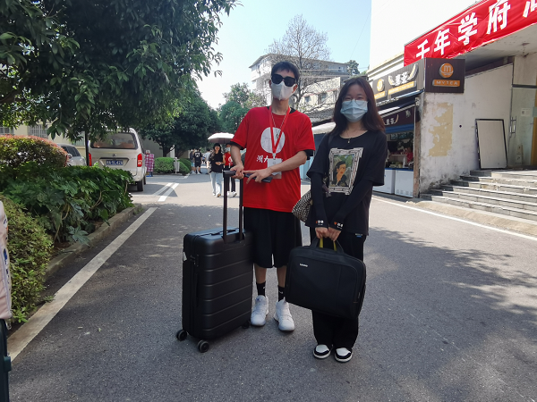 新生和家长一下车,迎新志愿者马上微笑着迎上去:“你好”,“欢迎来到公司”。受疫情影响,新生的陪同人员无法进入公寓园区。于是,迎新志愿者主动帮忙拎行李。在搬运行李的路途中,耐心解答新生的有关问题。
