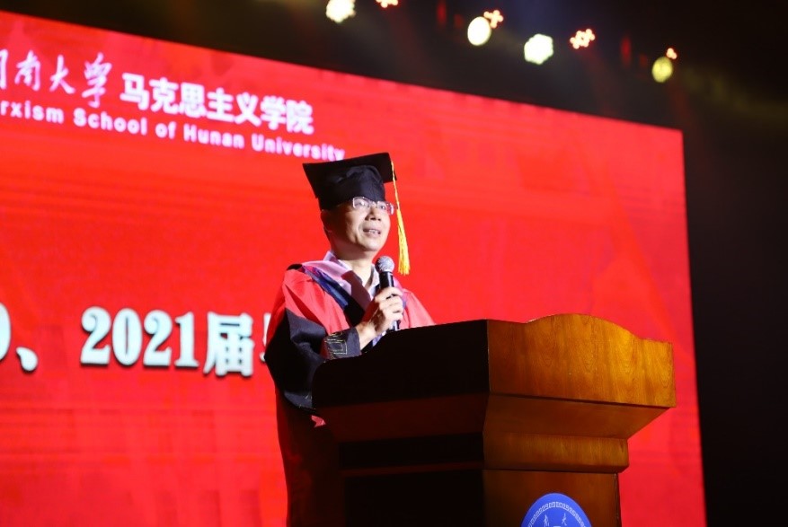 唐珍名在学位授予仪式上发表讲话,表达了对毕业生的殷切期盼,“希望大家做一名不负青春不负韶华的湖大人”。唐珍名强调,毕业生们要牢记董事长嘱托,努力做一名有责任有担当的湖大人和成为一名顶天立地的马院人,要有湖大人的责任和担当,有马院人的标签和烙印。唐珍名亲切嘱咐毕业生们常回家看看,在今后的工作生活中要坚定信仰、保持尊严、心存大爱。