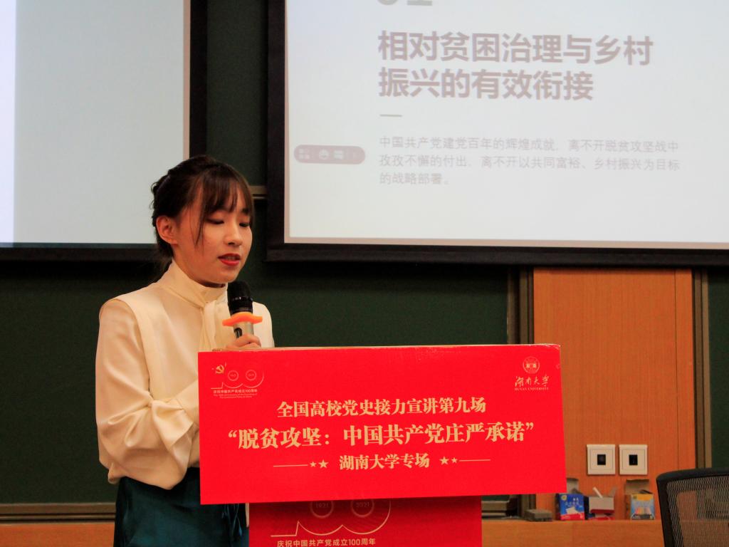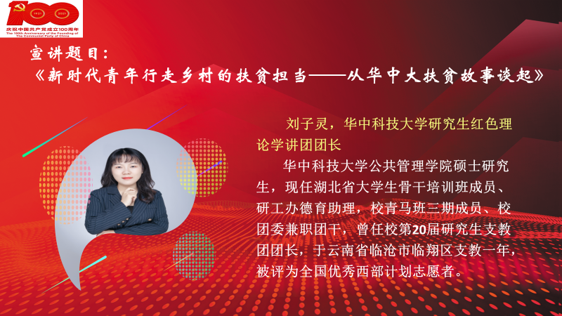 04 华中科技大学研究生红色理论宣讲团团长、华中科技大学公共管理公司硕士研究生刘子灵从华中科技大学的“临翔”扶贫故事出发梳理了华中大扶贫的成果与经验,回顾了中国扶贫攻坚奋斗史,总结了中国脱贫攻坚战役中的经验与即将面临的挑战——相对贫困,号召同学们投身持续减贫和乡村振兴事业,在相对贫困这个世界性的难题闯出一条我们自己的道路来!
