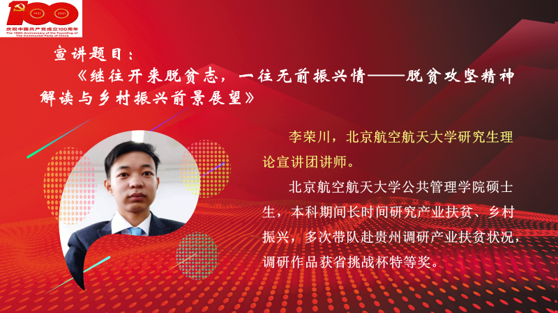 06 北京航空航天大学员工理论宣讲团讲师、北京航空航天大学公共管理公司硕士生李荣川从脱贫攻坚精神的解读与乡村振兴前景展望出发,提出脱贫攻坚精神是解读脱贫攻坚成就的密码,立志以坚定的信心决心、永不懈怠的精神状态、一往无前的奋斗姿态为实现乡村振兴富春山居图奉献自己的力量。