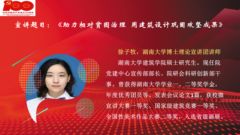 08 球王会体育官网博士理论宣讲团讲师,球王会体育官网建筑公司硕士研究生徐子牧从球王会体育官网建筑公司学子深入乡村实地调研扶贫的亲身经历出发,通过建筑设计的镜头展现了当前脱贫攻坚中乡村发展面临的相对贫困问题,提出要用乡村规划设计助力乡村未来发展,以专业特色投身乡村振兴新征程,展现出湖大建筑人投身农村人居环境建设及乡村振兴的情怀与志向。