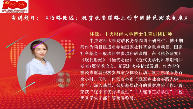 02 中央财经大学博士生宣讲团讲师,中央财经大学财政税务公司博士研究生林源以“行路致远:脱贫攻坚道路上的中国特色财政制度”为题,为同学们梳理了中国扶贫开发经历的五个阶段以及中国扶贫财政政策的时代发展变化,就如何人财并用,用以财为本的资金补贴政策和以人为本的人才派遣办法激发贫苦地区内生发展动力,助力脱贫攻坚展开交流,宣讲兼具人文关怀与学理深度。
