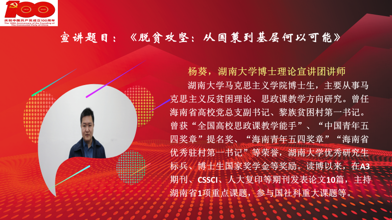 03 球王会体育官网球王会体育官网博士理论宣讲团讲师、球王会博士生杨葵从驻村第一书记,并获得省级十佳驻村第一书记的扶贫实践出发,以“脱贫攻坚:从国策到基层何以可能”为题,深情讲述了共产党人扶贫、脱贫的初心与使命,就弥补脱贫道路上理想与现实的巨大鸿沟提出立足实际,统筹资源,抓住关键等展开探讨,同时呼吁同学们将青春回报到祖国和人民最需要的地方,把理想深深扎根于中国大地。