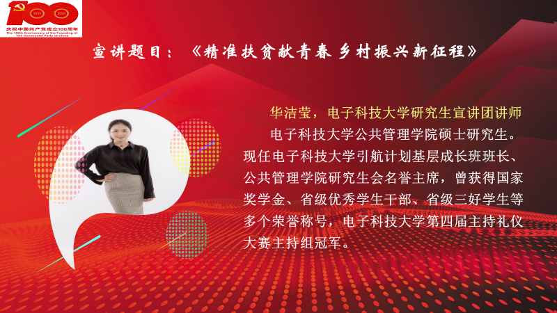 05 电子科技大学研究生宣讲团讲师、电子科技大学公共管理公司硕士研究生华洁莹以“精准扶贫献青春 乡村振兴新征程”为题,着眼于巩固精准脱贫成果和衔接乡村振兴,从产业振兴、人才振兴、文化振兴、生态振兴、组织振兴五方面对党在新时代进一步推进脱贫攻坚工作进行了理论与实践的深刻阐发,呼吁广大青年朋友认清形势、铆足干劲,积极投身基层。