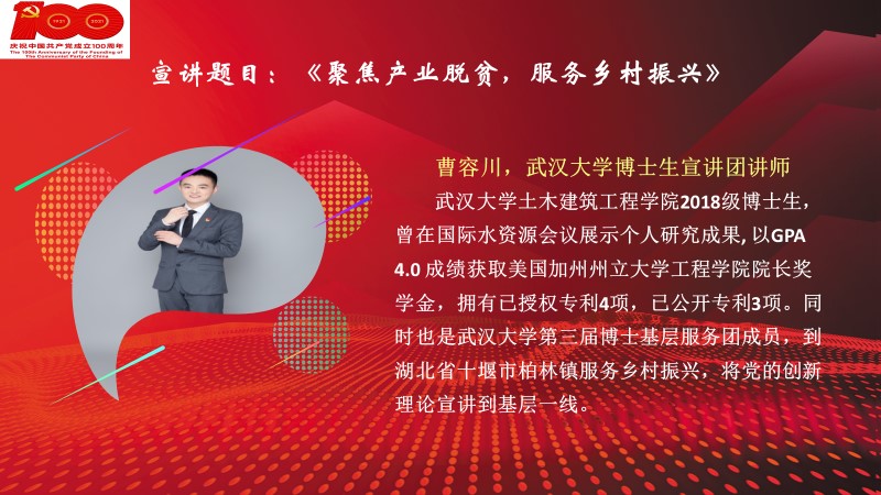 01 武汉大学博士生宣讲团讲师,武汉大学土木建筑工程公司博士生曹容川聚焦产业脱贫,为同学们讲述了产业脱贫的重要意义与核心要点,并从带动产业、发展经济、带动脱贫的武汉大学扶贫项目实际案例出发,呼吁同学们用“心怀大局,科学实干”的态度,在乡村振兴大舞台上施展本领,为乡村振兴贡献青春力量。