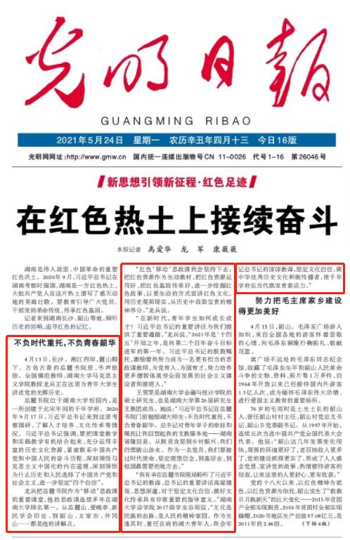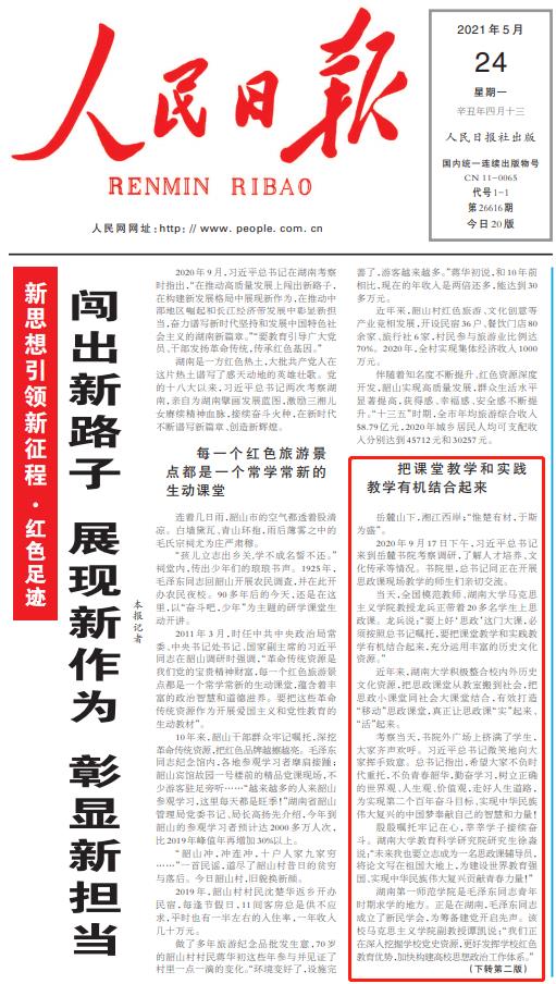 《人民日报》刊发头版头条文章《闯出新路子 展现新作为 彰显新担当》,再现了习总书记到球王会体育官网岳麓书院考察调研的场景。2020年9月17日,习近平总书记在考察球王会体育官网时勉励师生,“要把课堂教学和实践教学有机结合起来”。