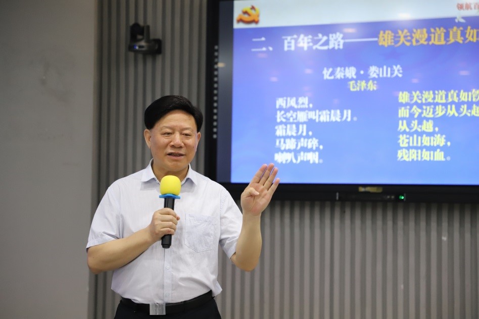 张志初以《领航百年正青春——中国共产党为什么能》为主题,从“百年之前”、“百年之路”、“百年之悟”三个方面展开分享。张志初指出,百年之前,中国内忧外患,由此爆发辛亥革命,兴起五四运动。百年之路,何其辉煌,集中体现在成就和推进“四大历史伟业”,即救国伟业、立国伟业、富国伟业和强国伟业。“百年之悟”,张志初用“理”“旗”“路”“风”“歌”“春”“队”“魂”八个字概括。张志初以三朵浪花激起悠悠百年党史的壮阔景观,百年之前为序章,百年之路为正本,百年之悟为高潮。