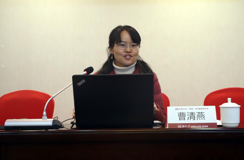 贾耀同学以“论新民主主义革命时期马克思主义中国化中的湖南因素”为题,从湖湘文化、湘籍革命家、湖南革命实践三个角度展开,提出了要将地方文化与地方历史融入“四史”教育中来。