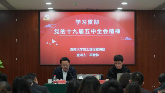 这一期的“双学双做、送学上门”的服务对象扩展到街道辖区楼宇商圈的企业。校博士理论宣讲团平智林博士为潇湘影业集团党员们送去十九届五中全会精神宣讲。平智林博士根据党中央关于《十九届五中全会》精神宣讲“六个讲清楚”要求,从全会背景概况、重大意义及公报解读三个方面,结合对湖南影视文化发展现状的认识展开精彩详实的宣讲。